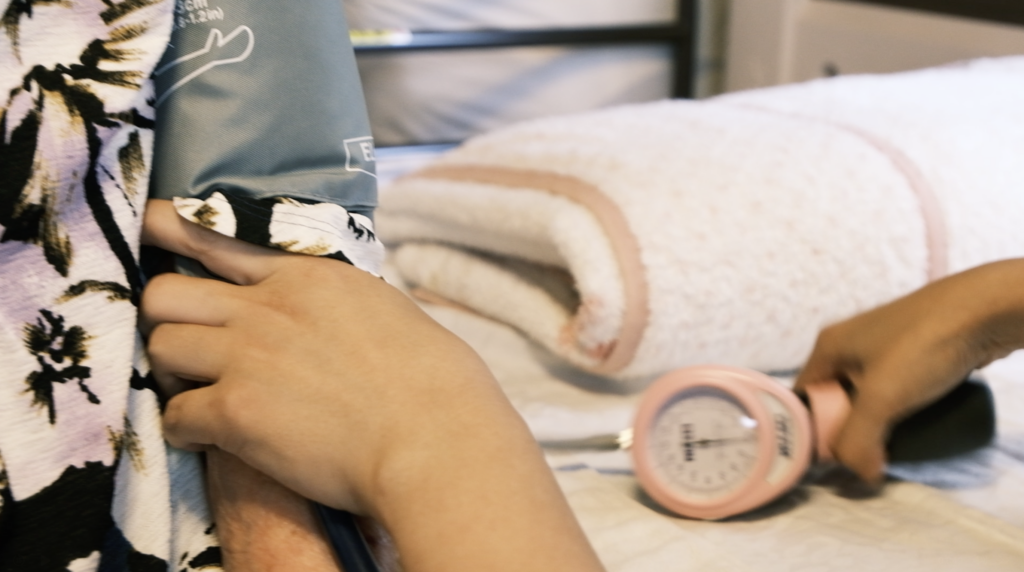 さまざまな血圧計を試した社長のひがしさんが選んだのは片手で操作できる血圧計。そして聴診器をあてて目と耳と手で相手をみれるタイプのもの。